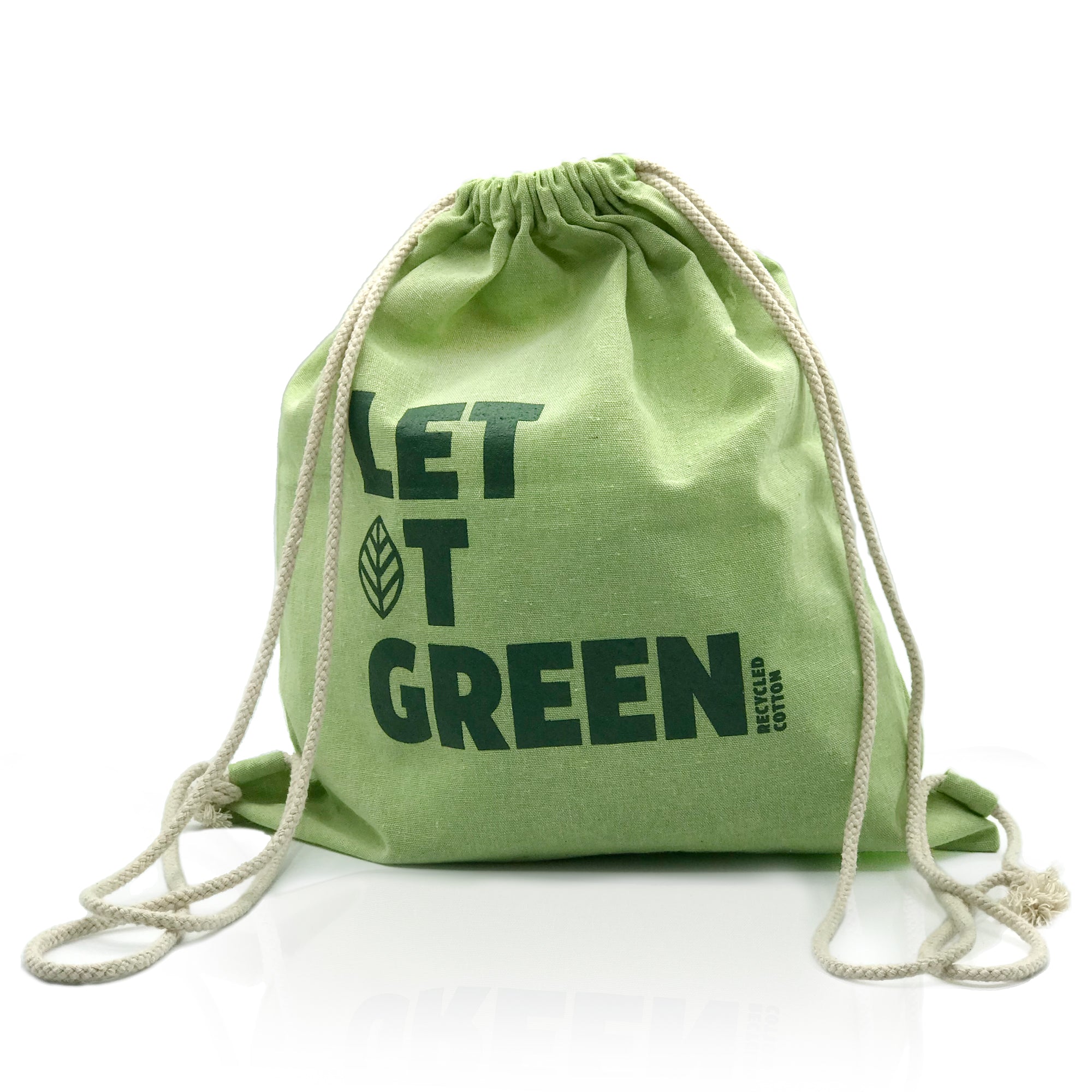 Mochila de algodón reciclado verde. Es una gran opción para llevar tus imprescindibles. No sólo es ecológica, sino que también es duradera y resiste un uso regular. La mochila se vende vacía.